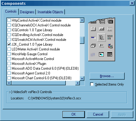 ActiveX control To use J2K-Control in your VisualBasic application you need to: 1. Register the control Execute the following command: 2. Add component to your VB toolbox Right click on the toolbox, select "Components" 3. Place the control on your form Using "J2" button, 4. A little coding Assuming your form has Form1 name and the J2K-Control has J2K_Codec1 name, add the following 3 lines into the Form_Load(): 5. Ordering If this ActiveX control suites your needs, you must purchase the full version prior to using it in any publicly distributed software. |